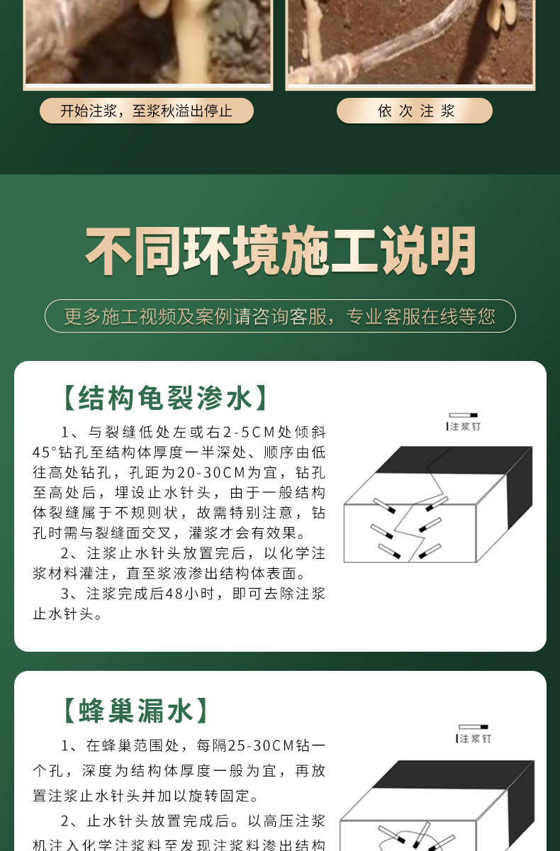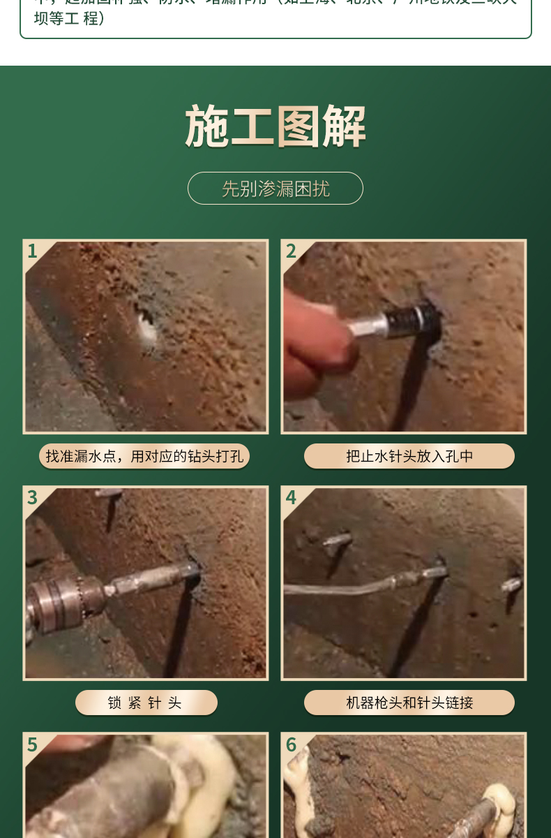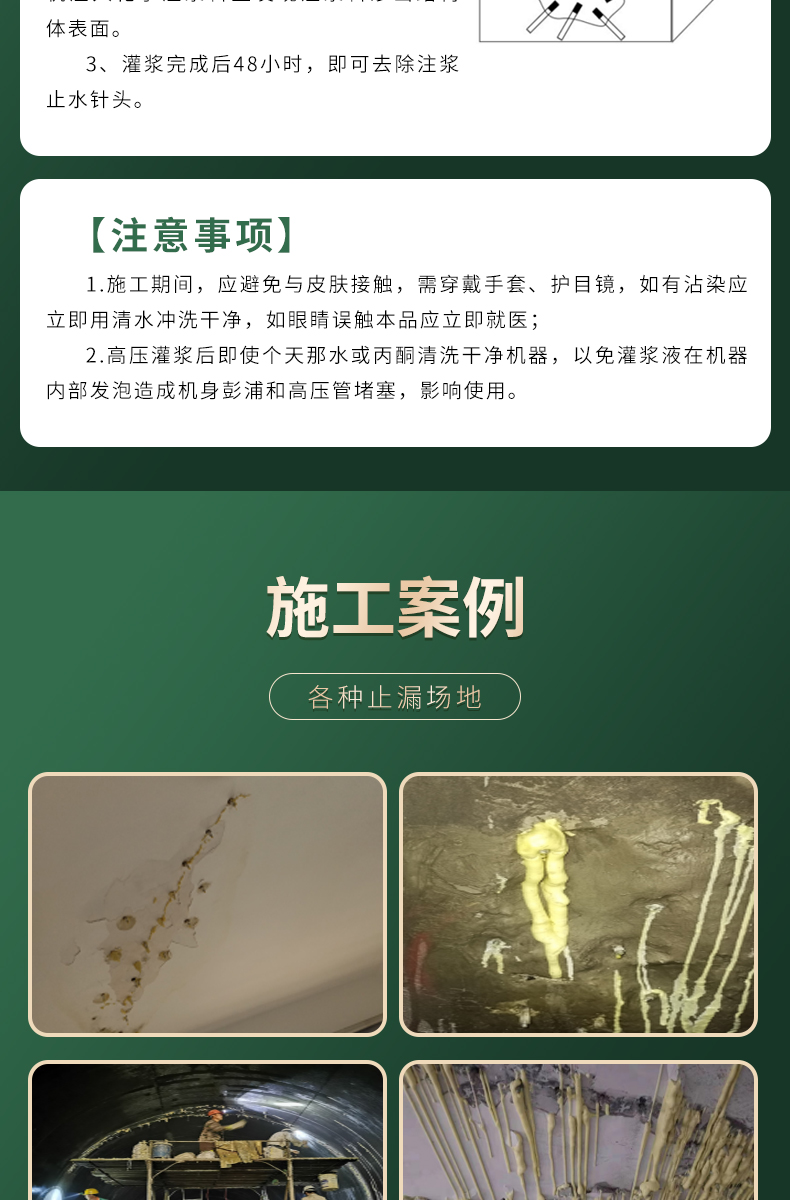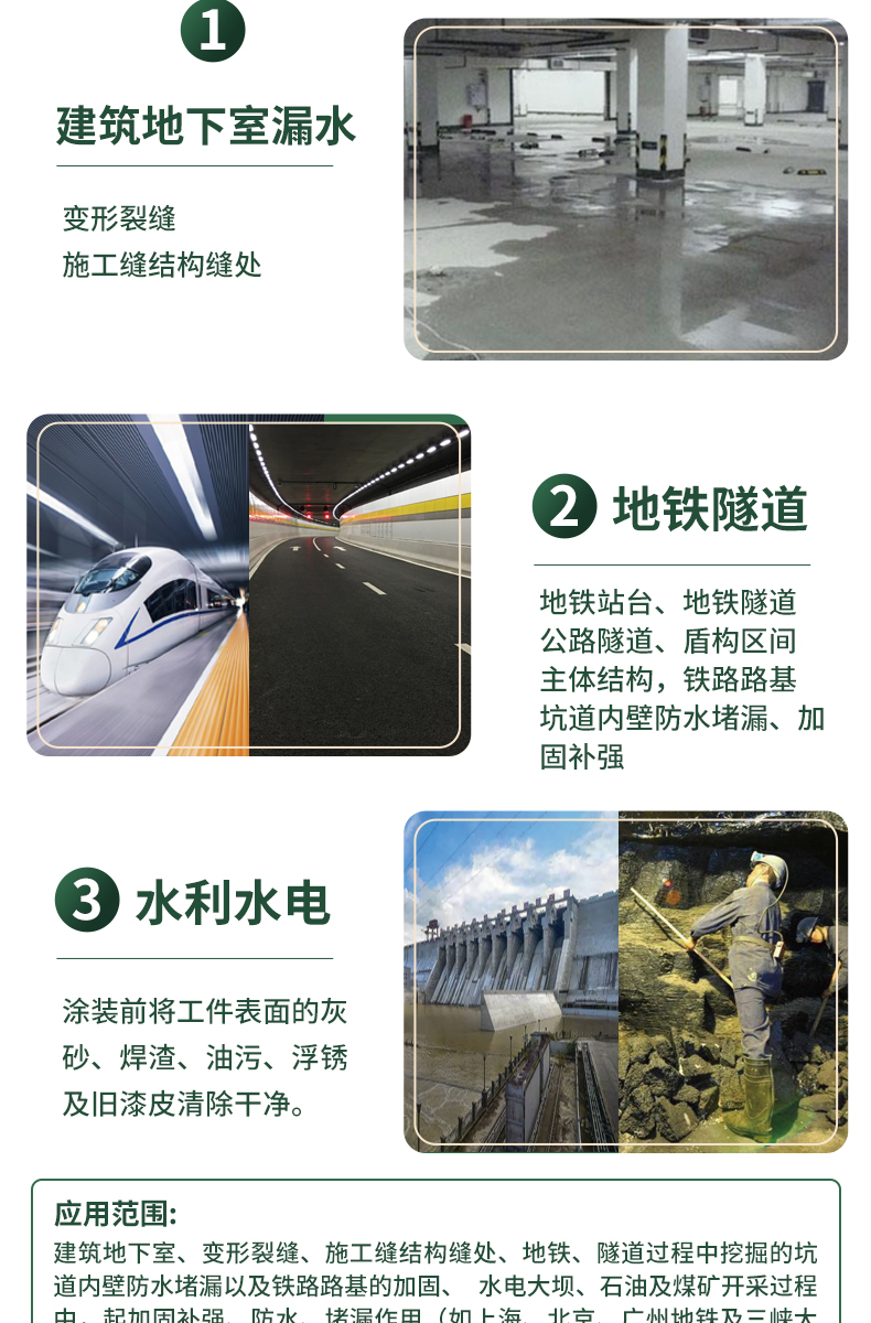 适用于地铁、隧道、涵箱、水坝、海港码头、车库、人防等地下工程的裂缝止漏加固。