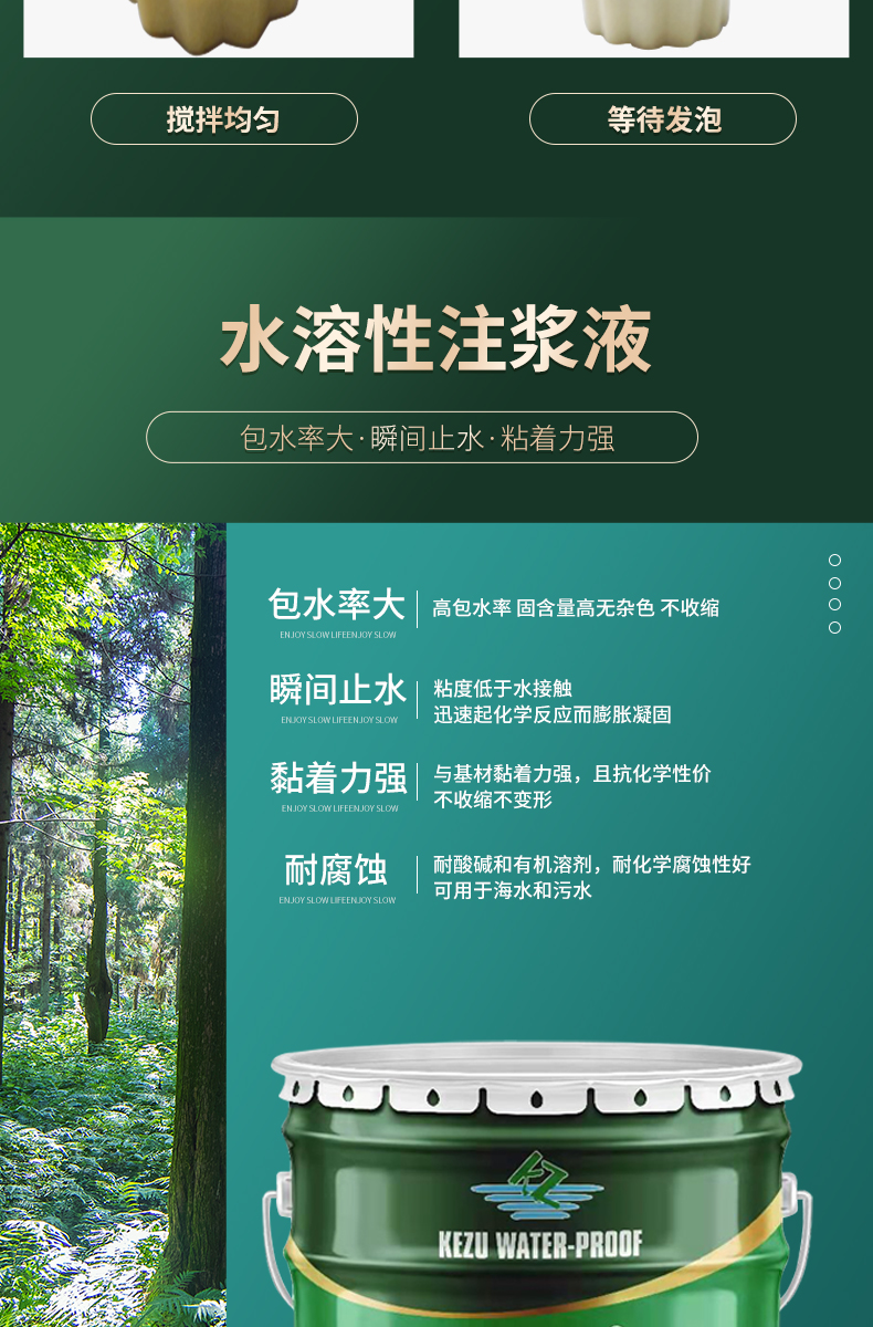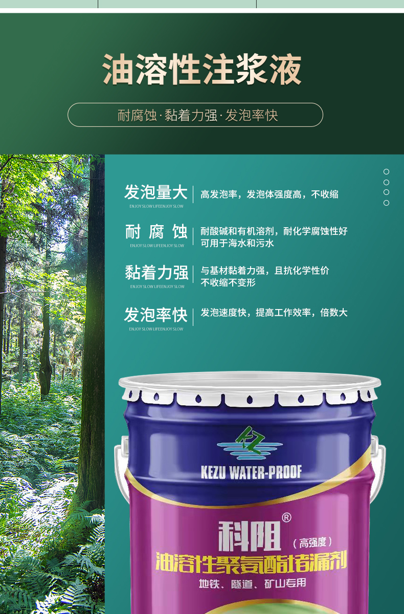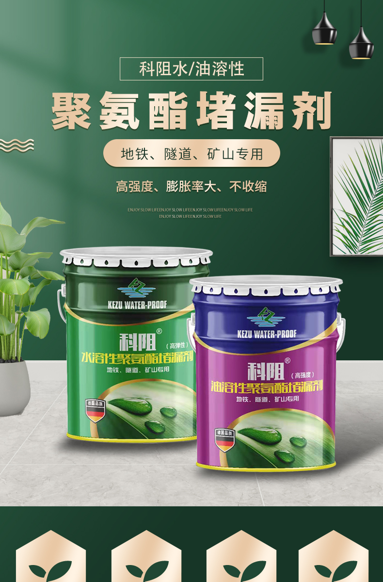 4、单液型注浆,粘度低,可灌性好,施工简便,清洗容易。