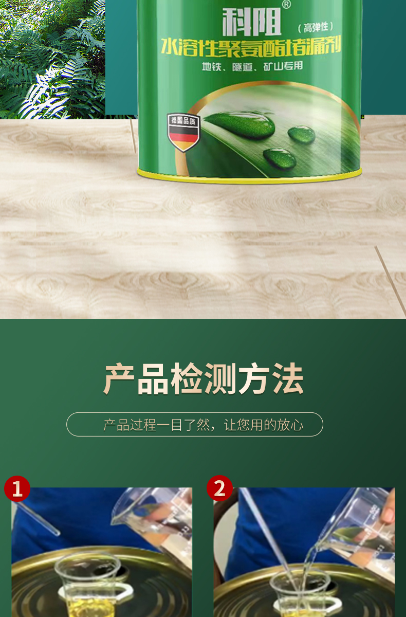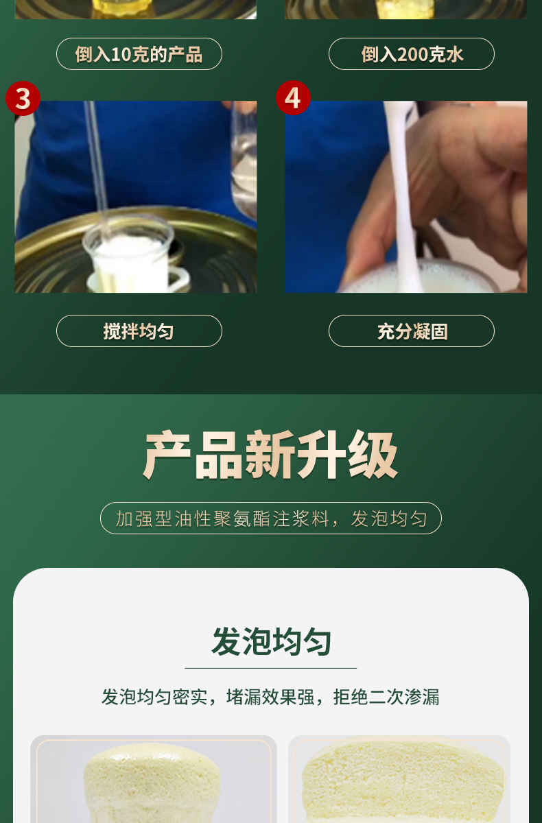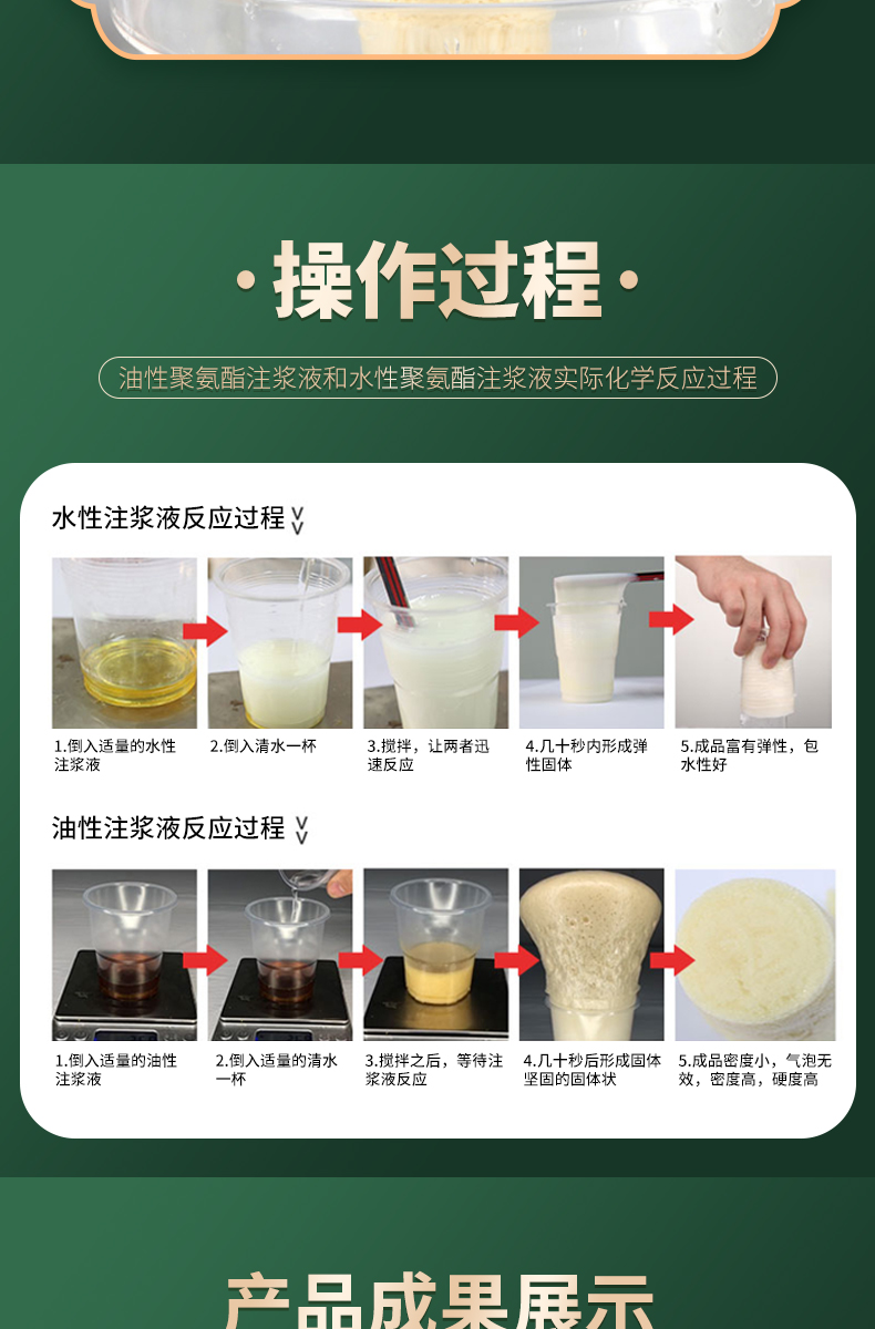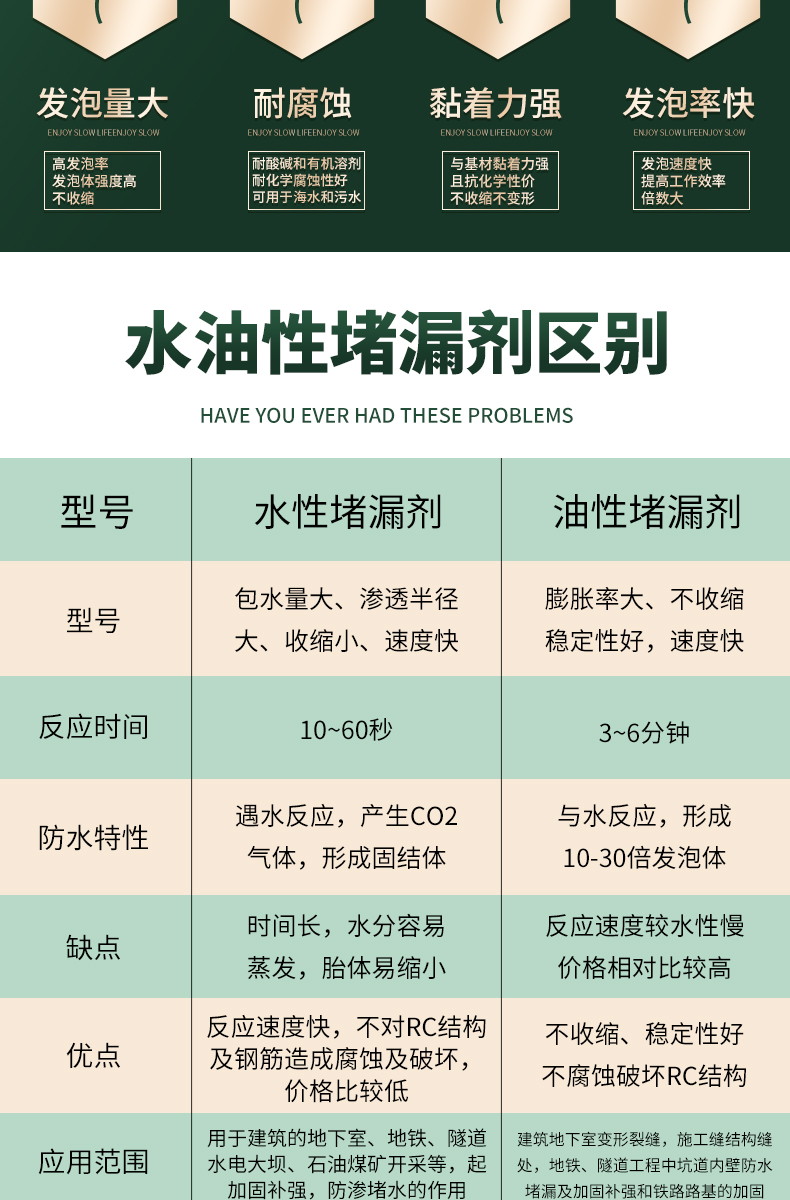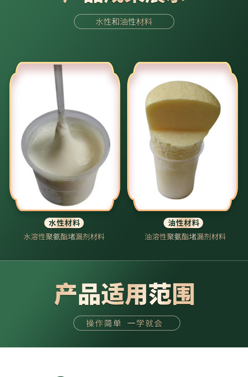 1、亲水性好,遇水后立即进行化学反应,分散乳化学泡膨胀。凝胶固结成高弹性物质,堵高裂缝,永久止水。